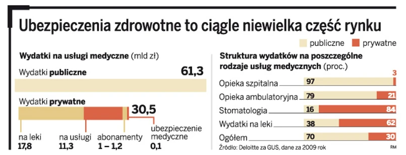 Ubezpieczenie zdrowotne w Polsce to raczkujący segment rynku. Szacuje się, że branża ubezpieczeniowa w 2010 roku zebrała z tytułu ich sprzedaży ok. 150 mln zł. Nawet gdyby dodać do tego abonamenty medyczne, łączna wartość rynku wynosi ok. 2,5 mld zł. To niewiele, jeśli porówna się to z wydatkami państwa na opiekę medyczną przekraczającymi 61 mld zł.