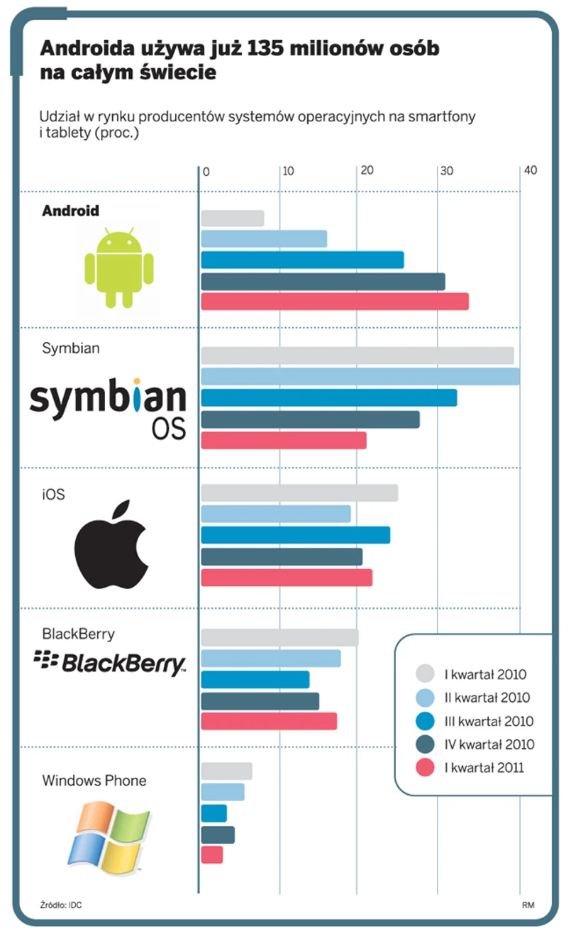 Na razie nie jest do końca jasne, kto dziś wygrywa w wojnie systemów operacyjnych. Według agencji badań marketingowych Nielsen na początku lipca 38 proc. udziału w rynku systemów operacyjnych używanych na smartfonach miał Android. Na drugim miejscu znalazł się Apple z iOS (28 proc.), na trzecim znane głównie menedżerom BlackBerry (21 proc.), a na czwartym miejscu Windows Phone (9 proc.). Z kolei z opublikowanych przez Apple'a danych po drugim kwartale wynika, że to on jest wciąż górą – z jego iOS na iPhone'ach, iPodach i iPadach korzysta 200 mln użytkowników. Android działa z kolei w 135 mln urządzeń na świecie.