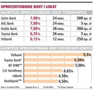 Trochę niższe oprocentowanie oferuje Citi Handlowy oraz mBank i MultiBank, a przy wyższych dobre warunki daje BZ WBK (od 4,25 do 5 proc.) oraz Toyota Bank, który również stosuje progresywne oprocentowanie uzależnione od zdeponowanej kwoty (od 3,60 proc. do 5,30 proc.).