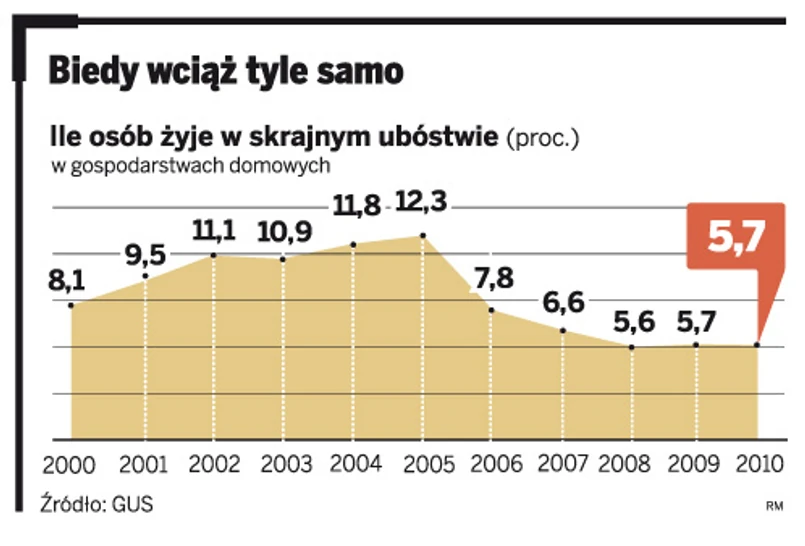W 2010 r. w skrajnym ubóstwie żyło 5,7 proc. Polaków. To tyle samo, ile w roku poprzednim. Ich wydatki były mniejsze od minimum egzystencji ustalanego przez Instytut Pracy i Spraw Socjalnych. Obejmuje ono wydatki pozwalające na skromne wyżywienie i utrzymanie bardzo małego mieszkania. Ale nie ma wśród nich np. wydatków związanych z komunikacją i kulturą. W ubiegłym roku takie minimum dla jednoosobowego gospodarstwa wynosiło 466 zł, a dla czteroosobowego (dwie osoby dorosłe i dwoje dzieci) 1257 zł.