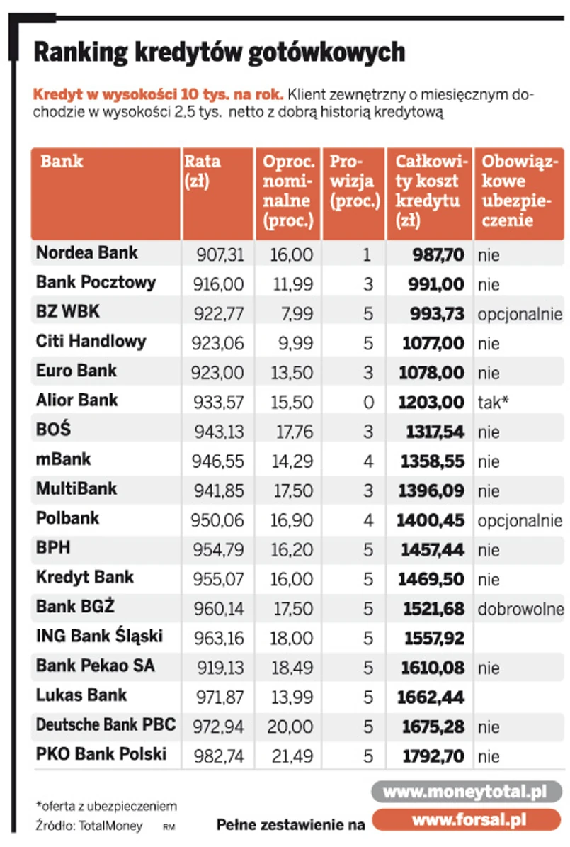 Nordea Bank ma wysokie oprocentowanie nominalne w wysokości 16 proc., ale oprócz 1-proc. prowizji nie nalicza żadnych dodatkowych kosztów w postaci innych opłat i ubezpieczeń. Pożyczając 10 tys. zł na rok, klient zewnętrzny, czyli taki, który nie ma w banku konta, musi zwrócić kwotę tylko o 987 zł wyższą. Miesięczna rata wynosi zaledwie 907 zł.