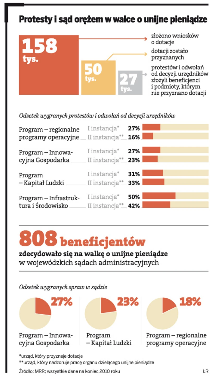 Urzędnicy przychylają się do ich odwołań nawet w co drugim przypadku. Tak jest w programie Infrastruktura i Środowisko. W Innowacyjnej Gospodarce czy w regionalnych programach operacyjnych – czyli w głównych źródłach dotacji dla firm – odsetek wygranych odwołań jest nieco niższy, ale i tak wynosi 27 proc. Podobna liczba beneficjentów wygrywa sprawy przed sądami administracyjnymi. Przykładem firmy, która przeszła całą drogę odwoławczą i zdecydowała się na spór w sądzie, jest krakowski Comarch. Dzięki temu dostał kilkaset tysięcy złotych na prowadzenie badań naukowych.