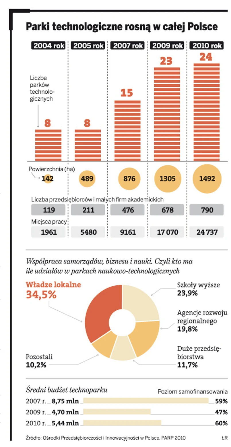 Pierwszym technoparkiem na świecie był założony w 1948 roku Bohanson Research Park w USA, ale prawdziwą karierę technoparków rozpoczął założony w 1951 r. przy Uniwersytecie Stanforda. Z czasem stał się znany jako Dolina Krzemowa. Dziś na świecie jest ich już blisko 1000. Pierwszy polski technopark powstał w 1995 r. w Poznaniu. Inwestycje nabrały tempa po 2004 r., kiedy zaczęto je finansować z funduszy UE. Jak wyliczyło Stowarzyszenie Organizatorów Ośrodków Innowacji i Przedsiębiorczości w Polsce, tylko do końca 2009 r. zainwestowano w te nowoczesne ośrodki we współpracy samorządów, biznesu i nauki ponad 650 mln zł. Połowa tej kwoty pochodziła z UE.