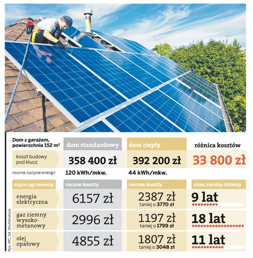 Zanim jednak zaczniemy oszczędzać, trzeba trochę zainwestować. Specjalne urządzenie wentylacyjne ograniczające straty ciepła kosztuje od 10 do 20 tys. zł, kolektor słoneczny to wydatek 12 tys. zł, a pompa cieplna kolejnych 20 – 30 tys. zł. W sumie budowa energooszczędnego domu jest o 10 – 30 proc. droższa niż podobnego budynku w technologii tradycyjnej, ale koszty zwracają się już po 10 – 15 latach.