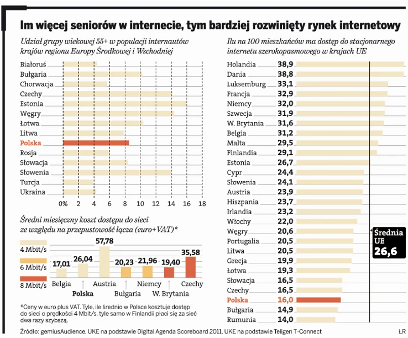 Pod względem dostępu do sieci znajdujemy się nawet poniżej średniej unijnej. We wszystkich 27 krajach UE internautów jest 70 proc. W najbardziej rozwiniętych krajach odsetek ten sięga przekracza 90 proc., co oznacza, że przy obecnym tempie mamy szansę dogonić je za 12 – 13 lat.