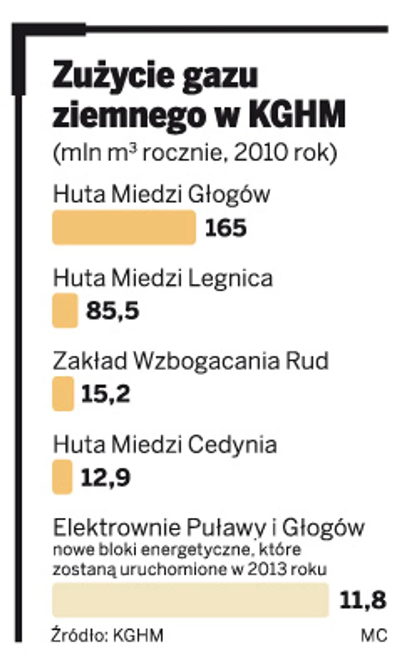 Obecnie miedziowa spółka gaz kupuje od Polskiego Górnictwa Naftowego i Gazownictwa. Surowiec nie jest importowany z Rosji, lecz pochodzi z krajowych złóż. KGHM jest jednym z większych odbiorców w Polsce. Rocznie zużywa ok. 130 mln m sześc. W najbliższych latach spółka może nawet podwoić zapotrzebowanie. Szacuje się, że będzie potrzebować min. 290 mln m sześc. gazu, z tego 150 na cele technologiczne, a kolejne 165 mln m sześc. na produkcję energii elektrycznej. Koncern na przełomie 2012 i 2013 r. w Polkowicach i Głogowie uruchomi bloki gazowo-parowe o mocach 2x42 MW.