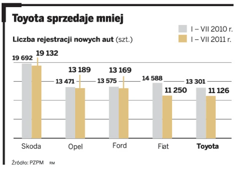 Brak Yarisa zaważył na wynikach japońskiej marki już w lipcu. W zeszłym miesiącu zarejestrowano w naszym kraju tylko 1,1 tys. toyot – o ponad 27 proc. mniej niż rok temu. Z czołówki sprzedawców w Polsce równie zły wynik odnotował tylko Fiat. Tymczasem konkurencja ze Skody, Forda, Renault, Volkswagena czy Kii zakończyła lipiec na plusie.