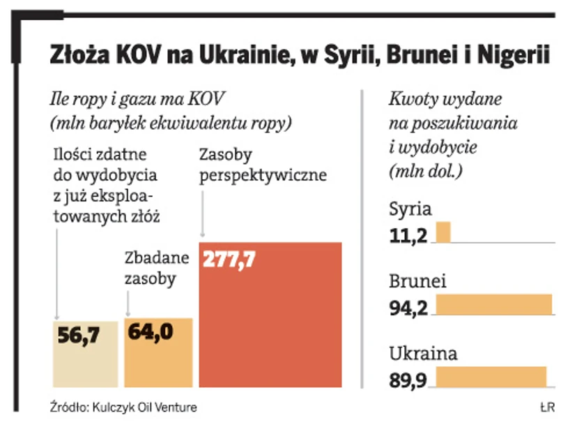 Poza Ukrainą i Syrią spółka, w której Kulczyk Investments ma prawie połowę kapitału, działa w Brunei i Nigerii. W tym pierwszym kraju KOV w ubiegłym roku wykonał dwa odwierty poszukiwawcze. – Obecnie trwają dalsze prace. Do połowy przyszłego roku wykonamy trzy kolejne odwierty – wyjaśnia Elliott.