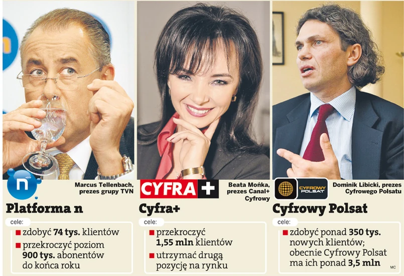 By jak najwięcej z nich trafiło do platform, a nie operatorów kablowych i darmowej oferty telewizji cyfrowej, Cyfrowy Polsat, Cyfra+ i platforma n szykują się do jesiennej ofensywy. Zdaniem analityków do końca roku mogą one przejąć nawet 400 tys. – 500 tys. klientów. Operatorzy szykują w tym celu promocje i nowe oferty.