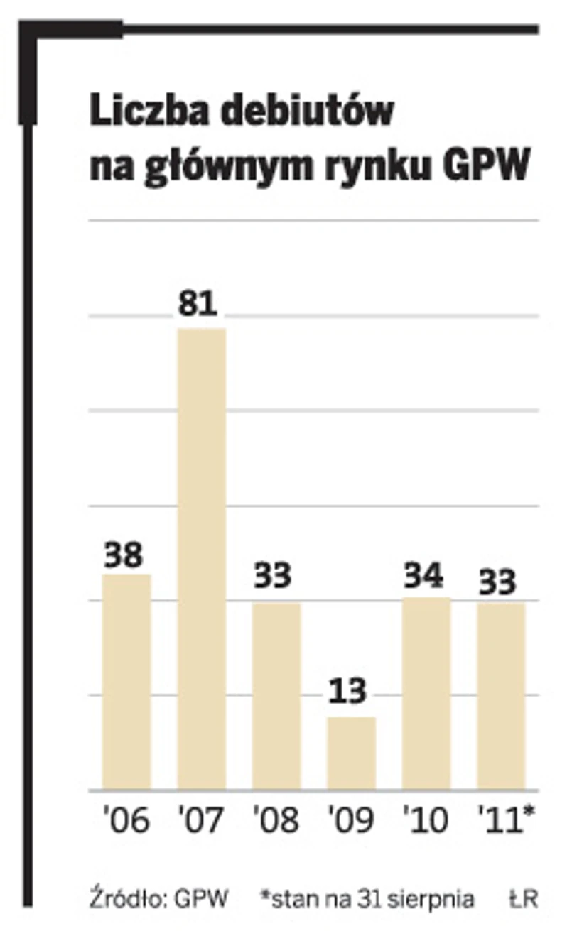 Pierwszych osiem miesięcy tego roku pod względem liczby debiutów było bardzo udanych dla głównego rynku warszawskiej giełdy. Pojawiły się tu 33 nowe spółki i wydawało się, że ubiegłoroczny wynik, kiedy zadebiutowały 34 firmy, zostanie z łatwością pobity. Nic z tego. – Panuje przekonanie, że obserwowane teraz odbicie na giełdach nie jest trwałe. W takiej sytuacji ciężko się spodziewać, aby w perspektywie najbliższych miesięcy zadebiutowała u nas jakaś nowa spółka – mówi Michał Sztabler, analityk domu maklerskiego Trigon.