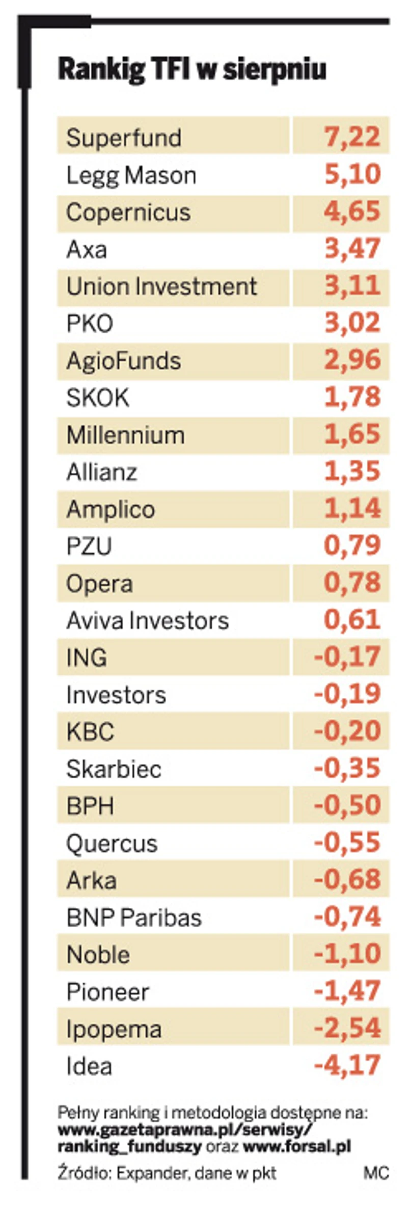 W comiesięcznym rankingu przygotowywanym przez Expandera oraz „DGP” zwyciężyło Superfund TFI z wynikiem 7,22 pkt.