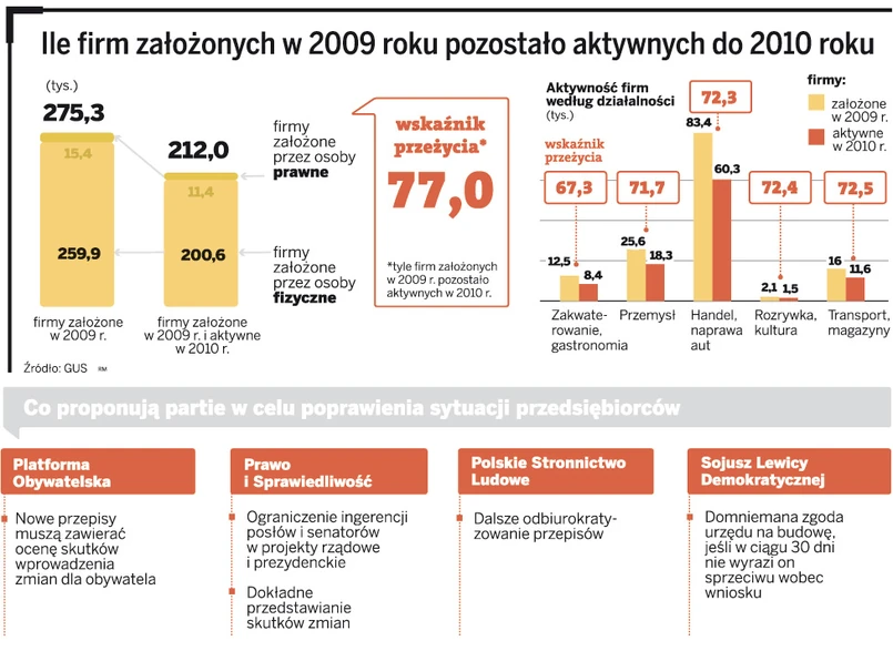 „Przedsiębiorcy powinni być traktowani nie jak potencjalni przestępcy, tylko jako pracodawcy i twórcy dochodu narodowego” – napisał w programie SLD, proponując np. domniemaną zgodę urzędu na budowę, jeśli w ciągu 30 dni nie wniesie zastrzeżenia do prośby inwestora. A PiS zapowiada kontrolę obecnych przepisów pod kątem tego, czy są przyjazne dla biznesu. Chce też wprowadzić przepisy, które mają pod tym kątem analizować przepisy unijne. Partia Jarosława Kaczyńskiego zapowiada nowe ustawy podatkowe o VAT, PIT i CIT. Mają być jasne i wykluczyć wątpliwości interpretacyjne. Chce też wprowadzić wiążące interpretacje ze strony ZUS.