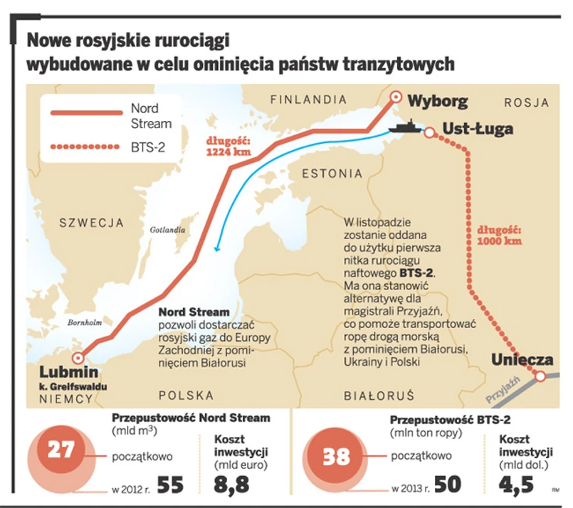 Premier Władimir Putin zapowiedział, że na początku listopada do użytku zostanie oddana pierwsza nitka rurociągu naftowego BTS-2 (druga część Bałtyckiego Systemu Rurociągowego). Biegnąca do portu Ust-Ługa pod Petersburgiem rura będzie alternatywą wobec magistrali „Przyjaźń”. Moskwa tym samym zaczęła uniezależniać się od państw tranzytowych: Ukrainy, Białorusi i Polski. – Spokojnie odchodzimy od dyktatu państw tranzytowych. Jest to nasze okno na Europę w energetyce – komentował premier Rosji. I precyzował, że dzięki oddaniu do użytku bałtyckiej rury Ukraina utraci ekskluzywne położenie kraju tranzytowego. A to w czasie, gdy Kijów negocjuje niższą cenę na rosyjski gaz. Jak wynika z obliczeń ukraińskiego Centrum Razumkowa, Kijów w wyniku uruchomienia Nord Streamu straci nawet 1 mld dolarów rocznie z opłat tranzytowych.