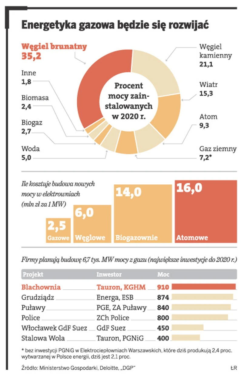 Pierwsze duże, systemowe bloki napędzane gazem mają szansę zacząć pracę w Polsce w 2014 r. Do budowy takich siłowni przymierzają się najwięksi gracze na rynku energii, a także Polskie Górnictwo Naftowe i Gazownictwo oraz Orlen. Jednym z powodów zainteresowania takimi inwestycjami są ich niższe koszty. Zwykle szacuje się, że na bloki gazowe o mocy 1000 MW trzeba wydać 650 – 700 mln euro, a na węglowe ok. 1,3 mld euro.