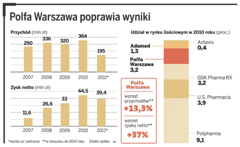 Polfa wzbudza tak duże zainteresowanie wśród inwestorów, bo ma technologię do produkcji form sterylnych leków, takich jak ampułki. Pod względem udziałów w rynku ilościowym plasuje się na czwartym miejscu w Polsce wśród ponad pół tysiąca firm farmaceutycznych. Po pierwszym półroczu tego roku spółka pokazała świetne wyniki finansowe. Przy 195 mln zł przychodów zarobiła na czysto 39,4 mln zł. W całym 2010 r. uzyskała 364,4 mln zł przychodów (wzrost o 13,3 proc. w stosunku do 2010 r.) i 44,4 mln zł zysku netto (+37 proc.). Kolejne lata zapowiadają się równie dobrze, bo według najnowszego raportu Deloitte przed całym sektorem farmaceutycznym rysują się obiecujące perspektywy. – Branża rośnie od kilku lat, niezależnie od tego, co się dzieje w gospodarce – mówi Tomasz Ochrymowicz z Deloitte.