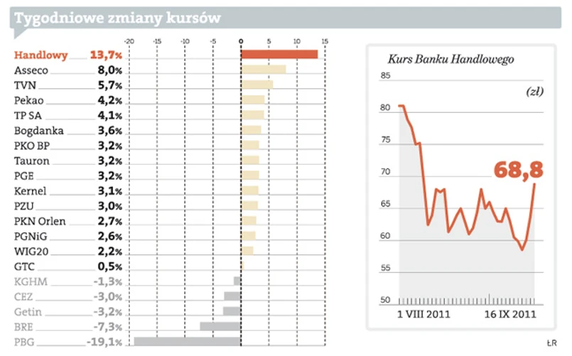 Dzięki wzrostowi o 13,7 proc. Bank Handlowy zdeklasował konkurencję z grona największych spółek wchodzących w skład indeksu WIG20. Numer dwa w tygodniowym rankingu, Asseco, może się pochwalić 8-proc. wzrostem.