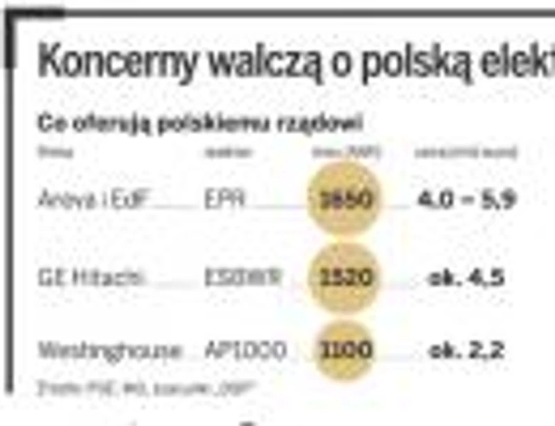Co zaproponują najpoważniejsi gracze? Francuska Areva wyśle w bój reaktor EPR o mocy 1650 MW, amerykański Westinghouse reaktor AP 1000 o mocy 1100 MW, a amerykańsko-japoński GE Hitachi wystawia dwa reaktory: ESBWR (ok. 1600 MW) i ABWR (1350 MW).