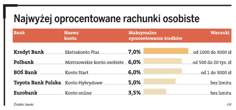 Z kolei w Polbanku na Mistrzowskim koncie osobistym można dostać 6 proc. w skali roku. – Takie oprocentowanie obowiązuje dla kwot w przedziale między 500 zł a 20 tys. zł. Nasze konto może więc być traktowane jako połączenie rachunku rozliczeniowego i oszczędnościowego – mówi Magdalena Markiewicz, dyrektor w Pol- banku EFG. Oprocentowanie w wysokości 6 proc. ma jeszcze konto w BOŚ Banku dla salda do 3 tys. zł. Toyota Bank Polska oferuje 5 proc.
