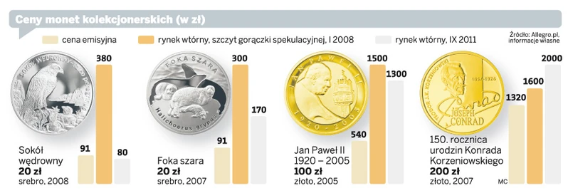 Tymczasem monety bite w małych nakładach (przykład monety Konrada Korzeniowskiego, 8,5 tys. sztuk) dały zarobić. Mejer uważa jednak, że już za kilka miesięcy monety mogą nie być tak tanie. – Obserwujemy powolny powrót zainteresowania numizmatami kolekcjonerskimi – mówi „DGP”.