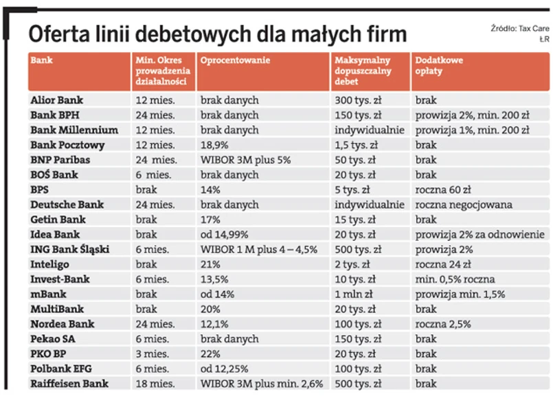 W dodatku te banki, które otwierają linię debetową nowym firmom, ustalają zwykle niewielki limit. W Banku BPS będzie to 5 tys. zł, w Inteligo 2 tys. zł. W mBanku startująca firma może liczyć na co najwyżej 10 tys. zł debetu. Dopiero starsze przedsiębiorstwa zyskują dostęp do większych pieniędzy.