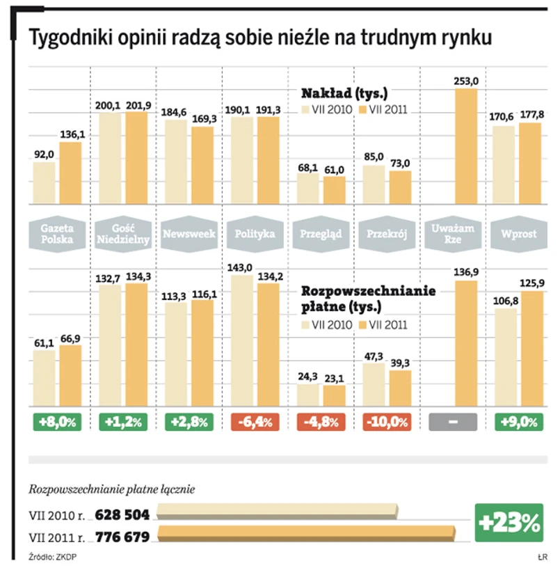 Pozostałe tygodniki także mają nie najgorsze wyniki sprzedaży: albo ją lekko poprawiły, albo przynajmniej zatrzymały tendencję spadkową. Teraz probują odbudować pozycję na rynku reklamy. Inwestują w wersje na tablety, aby przekonać do siebie reklamodawców zainteresowanych raczej reklamą internetową i mobilną. Z sukcesem udaje się to choćby „Polityce”, która jak się nieoficjalnie dowiedzieliśmy, sprzedaje co tydzień ponad 2 tys. egzemplarzy na iPada i Kindle’a.