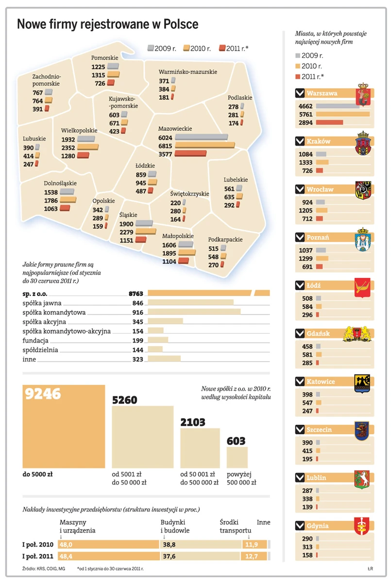 Dziś najwięcej firm rejestrowanych jest w Warszawie, Krakowie i Poznaniu. Średniomiesięcznie jest to odpowiednio 480, 111 i 108. Dla porównania w Szczecinie rejestrowane są tylko 34 nowe spółki miesięcznie, w Częstochowie – 10, Opolu – 8, a w Płocku i Słupsku – ledwie po 4.
