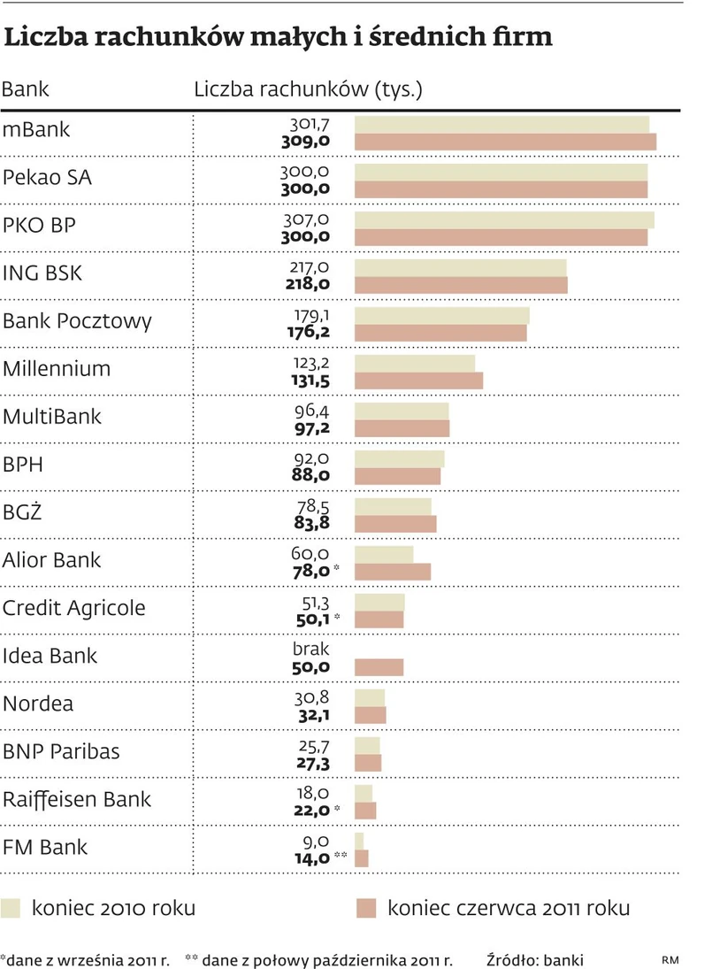 W bankach takich jak PKO BP, Pekao, ING BSK czy Bank Pocztowy liczba rachunków rozliczeniowych prowadzonych dla małych i średnich firm jest stabilna lub nieznacznie spada. Klientów przybywa natomiast dynamicznie w instytucjach, które agresywnie konkurują o sektor MSP.