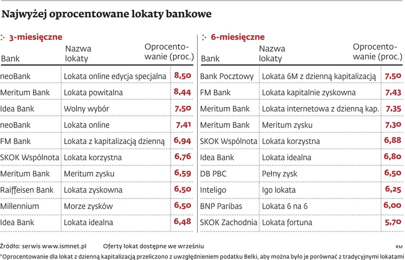 Najzyskowniejsze lokaty 3-miesięczne pozwalają zarobić ponad 8,50 proc. Na ponad 7 proc., mogą liczyć osoby chcące ulokować pieniądze na 6 i 12 miesięcy.