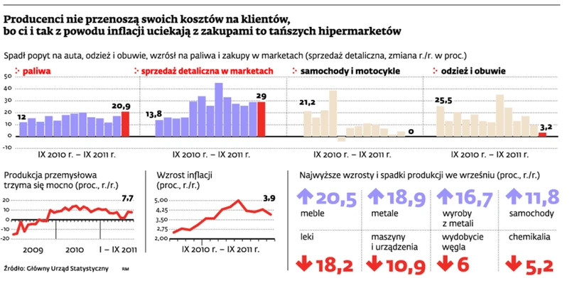 Problemy odczuli producenci i importerzy samochodów. Chociaż sprzedaż detaliczna ogółem rośnie, to sprzedaż aut we wrześniu w porównaniu z analogicznym okresem ubiegłego roku nie drgnęła. W dodatku to właśnie w tej branży, po producentach koksu i produktów z ropy naftowej, najbardziej rosły koszty wytwórstwa – o 2,6 proc. w porównaniu z sierpniem. To efekt słabego złotego, który wpływa na wzrost cen części i komponentów z importu.