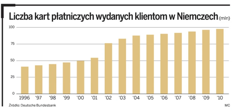 W Niemczech jest dziś około 93 mln kart płatniczych, co przy populacji sięgającej 82 milionów oznacza, że trudno dziś spotkać za Odrą kogoś bez opatrzonego złotym czipem kawałka plastiku w portfelu. Karty są jednak używane głównie do obsługiwania transakcji powyżej 50 euro. Większość (czyli ok. 70 proc.) zakupów poniżej tej sumy odbywa się wciąż drogą gotówkową.