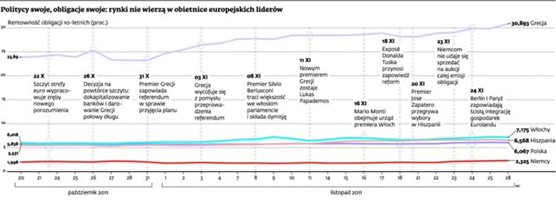 Oczy wszystkie zwrócone są teraz na Berlin i Paryż. Duet Merkel – Sarkozy zaproponuje 9 grudnia na szczycie UE projekt unii fiskalnej, w której budżety państw będą poddawane kontroli. Problem w tym, że rynki nie wierzą w kolejne „szczyty ostatniej szansy” i projekty „unii stabilności”. Coraz częściej kwestionowane jest przywództwo duetu Merkozy.