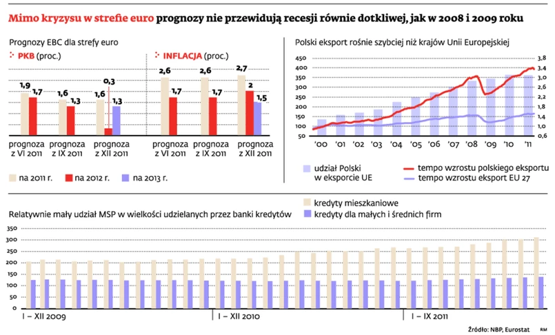 Największym niebezpieczeństwem dla polskiej gospodarki może okazać się wyhamowanie inwestycji. I to zarówno tych publicznych, finansowanych ze środków budżetowych i funduszy unijnych, jak i tych prywatnych. W pierwszej połowie roku nie powinno być jeszcze źle, bo nadal rozpędzone będą inwestycje publiczne związane z Euro 2012, ale potem zaczną wygasać. Będzie też nieco mniej pieniędzy na budowę nowych dróg. – Dynamika wzrostu inwestycji może być do połowy roku nawet dwucyfrowa, ale potem wyhamuje do 1,5 proc. – mówi prof. Orłowski. A to oznacza pogorszenie kondycji spółek zwłaszcza z branży budowlanej. W takiej sytuacji należy się liczyć z przykręceniem kurka z kredytami dla firm. Z kolei przedsiębiorstwa, które mają dziś zgromadzone środki, nadal będą wstrzymywały się z inwestycjami. To oznacza pogorszenie sytuacji na rynku pracy. Co prawda rząd szacuje, że w grudniu tego roku stopa bezrobocia wyniesie 12,3 proc., ale gdy spełnią się czarne prognozy, może ono przekroczyć 13 – 14 proc. Wyższe bezrobocie oznacza zaś spadek popytu wewnętrznego i wyhamowanie produkcji. – W takiej sytuacji wystarczy eskalacja kryzysu w strefie euro i osłabienie eksportu, by nasze firmy, a wraz nimi cała gospodarka, wpadły w poważne turbulencje – mówi Andrzej Arendarski, prezes Krajowej Izby Gospodarczej.