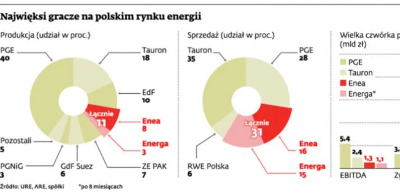 Na połączenie Enei i Energi zgodę musiałby wydać Urząd Ochrony Konkurencji i Konsumentów. W postępowaniu dotyczącym PGE i Energi urząd antymonopolowy przede wszystkim wziął pod lupę wpływ na kształtowanie cen nowego podmiotu i jego wpływ na odbiorców końcowych. I na połączenie nie zezwolił. Jak będzie w przypadku Enei i Energi? Małgorzata Cieloch, rzecznik urzędu, na temat potencjalnych scenariuszach nie chce się wypowiadać. – Jeśli wniosek wpłynie, będziemy badać transakcję w oparciu o stosowane do tej pory metody – informuje tylko. Nowy podmiot powstały w wyniku fuzji, z udziałami w dystrybucji i sprzedaży energii grubo ponad 30-proc., konkurowałby z dwoma największymi graczami na rynku, czyli PGE i Tauronem. Znacznie odstawałby pod względem mocy wytwórczych, bo elektrownie Kozienice (Enei) i Ostrołęka (Energi) dają ok. 11 proc. udziałów w produkcji energii.