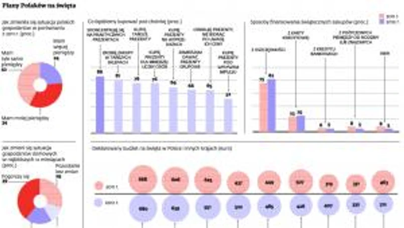 Według ekspertów niewykluczone, że wydamy nawet mniej, niż deklarujemy. Tak było np. w ubiegłym roku, gdy statystyczna polska rodzina wydała tylko 280 euro, a nie jak deklarowała – 463 euro. To był pierwszy rok spadków, bo dotychczas wydatki świąteczne w naszym kraju rosły – np. w 2011 r. deklarowany budżet był o 150 zł większy niż w 2010 r.