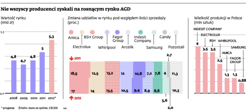 Chętkę na podium ma też Indesit Company. – W ciągu ostatnich dwóch lat urośliśmy o 3 pkt proc. To świadczy o tym, że jesteśmy na dobrej drodze – skomentował Lorenzo Fiorani, nowy country manager firmy w Polsce. Firma zwiększa też produkcję – do 4 mln sztuk w 2012 r., co zdaniem Wojciecha Koneckiego plasuje Indesit na pierwszym miejscu w Polsce. Ale tak naprawdę każda z firm ma szansę wskoczyć na pudło, bo pomiędzy liderami rynku różnice w udziałach są niewielkie.