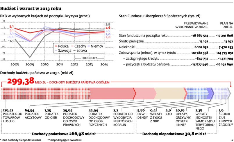 Główna słabość bierze się ze sposobu tworzenia projektu. MF przygotowuje założenia już w pierwszej połowie roku, patrząc na wyniki gospodarki wstecz. Założenia na ten rok były umiarkowanie optymistyczne, takie, jakby gospodarka nadal miała się stopniowo rozwijać. Efekt to przestrzelona prognoza dochodów. Przyjęto ją, choć już od połowy 2012 r. wpływy budżetowe wyraźnie hamowały.
