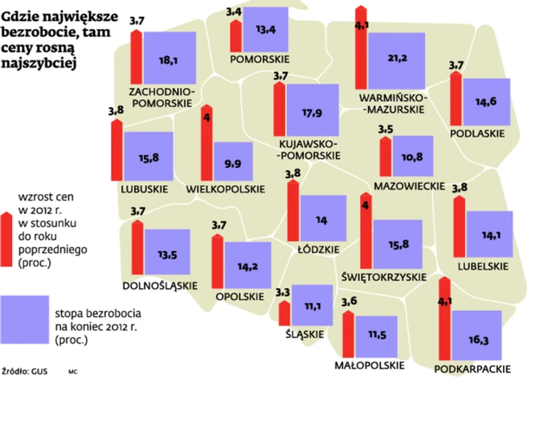 PKB liczony na mieszkańca woj. podkarpackiego jest o jedną trzecią niższy niż średnia dla kraju, woj. warmińsko-mazurskiego o 26 proc., a świętokrzyskiego – o 24 proc. A to jeszcze nie koniec złych wiadomości. W tych regionach mamy również największe bezrobocie – na koniec grudnia 2012 r. dla woj. świętokrzyskiego jego stopa wynosiła 15,8 proc., a dla warmińsko-mazurskiego ponad 21 proc. Na pierwszy rzut oka jest to paradoks – tam, gdzie najwięcej ludzi nie ma pracy, a zarobki są najniższe, ceny rosną najszybciej. Ale eksperci mają na to wytłumaczenie.