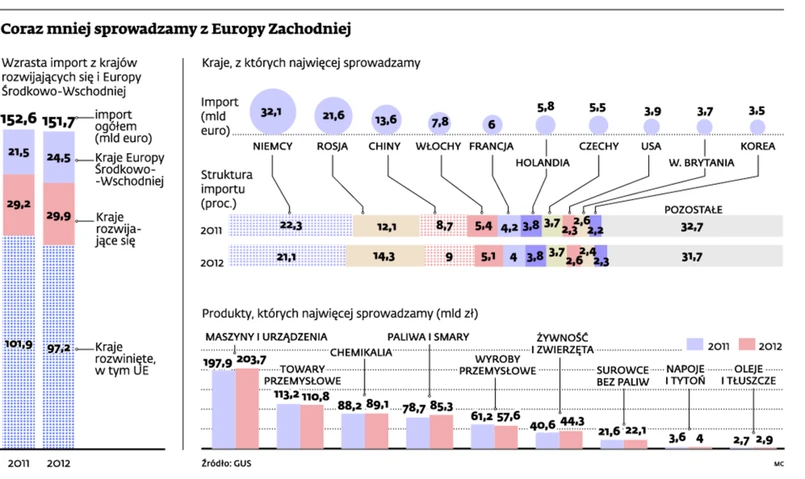 – Spadek importu z Unii Europejskiej obserwujemy od połowy ubiegłego roku. To efekt ograniczenia inwestycji publicznych i konsumpcji. Coraz mniej sprowadzamy z Zachodu wysoko wyspecjalizowanego sprzętu, materiałów, wyrobów – tłumaczy Rafał Benecki, ekonomista