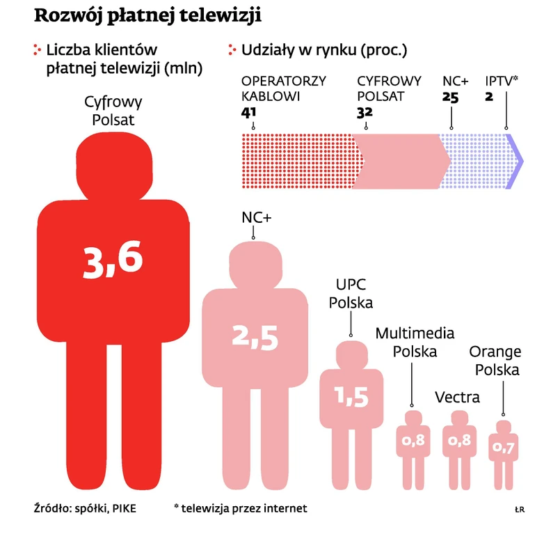 – NC+ najpierw skupi się na obronie swojej bazy klientów, bo ryzyko utraty części z nich zawsze rośnie przy łączeniu się operatorów. Części klientów kończą się umowy, część korzystała dotychczas z obu platform i na pewno będzie chciała teraz zmniejszyć swoje miesięczne koszty – tłumaczy Waldemar Stachowiak, analityk biura maklerskiego Ipopema Securities. Dziś NC+ ma 2,5-mln bazę abonentów. A konkurenci – platforma Cyfrowy Polsat oraz kablówki UPC Polska, Multimedia Polska czy Vectra – tylko czekają, aż NC+ powinie się noga, i będą próbowali przejąć od niego jak najwięcej abonentów.