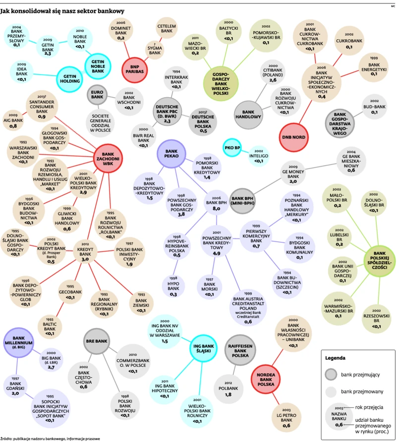 Pierwszy to Pekao. W drugiej połowie lat 90. decyzją urzędników wziął on pod swoje (państwowe jeszcze) skrzydła trzy inne instytucje kontrolowane przez Skarb Państwa. Kilka lat później, gdy pozyskany w ramach prywatyzacji inwestor – włoski UniCredit – kupił niemiecką grupę HVB (dawniej: HypoVereinsbank), łupem Pekao miał paść Bank BPH. Tym razem (już zupełnie inni) urzędnicy byli przeciwni fuzji – ostatecznie BPH został podzielony, ale i tak było to największe z dotychczasowych przejęć na naszym rynku, biorąc pod uwagę udziały rynkowe inkorporowanych instytucji.