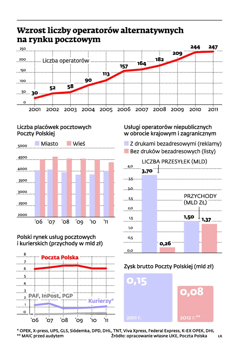 Według urzędu na rynku działa obecnie ponad 200 operatorów pocztowych. Większość to gracze lokalni, niezainteresowani ekspansją ogólnopolską, ale są wśród nich tacy, jak Angaria, Polska Grupa Pocztowa, Polskie Centrum Doręczeniowe „Petrox” czy PS-T Avistrans, którzy chcą korzystać z liberalizacji rynku i rosnąć kosztem PP. Obecnie narodowy monopolista ma ponad 90-proc. udział w rynku, którego wartość rocznie wyceniana jest na ok. 6,6 mld zł.