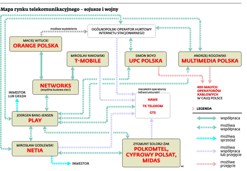 Głównymi rozgrywającymi w kształtowaniu nowego układu sił są Orange Polska, T-Mobile oraz imperium Zygmunta Solorza-Żaka, w skład którego wchodzą Midas, Polkomtel i Cyfrowy Polsat. Sieci komórkowe czekają teraz duże wydatki na rozbudowę sieci mobilnego internetu LTE. Dlatego analitycy nie wykluczają, że Play może podzielić te koszty z NetWorksem, czyli spółką Orange i T-Mobile. Miroslav Rakowski, prezes tego ostatniego, powiedział DGP, że takie rozmowy trwają. Część analityków uważa, że Play może też zwrócić się w kierunku firm Zygmunta Solorza-Żaka. Przedstawiciele Midasa twierdzili niedawno, że wkrótce z ich sieci może korzystać podmiot zewnętrzny.