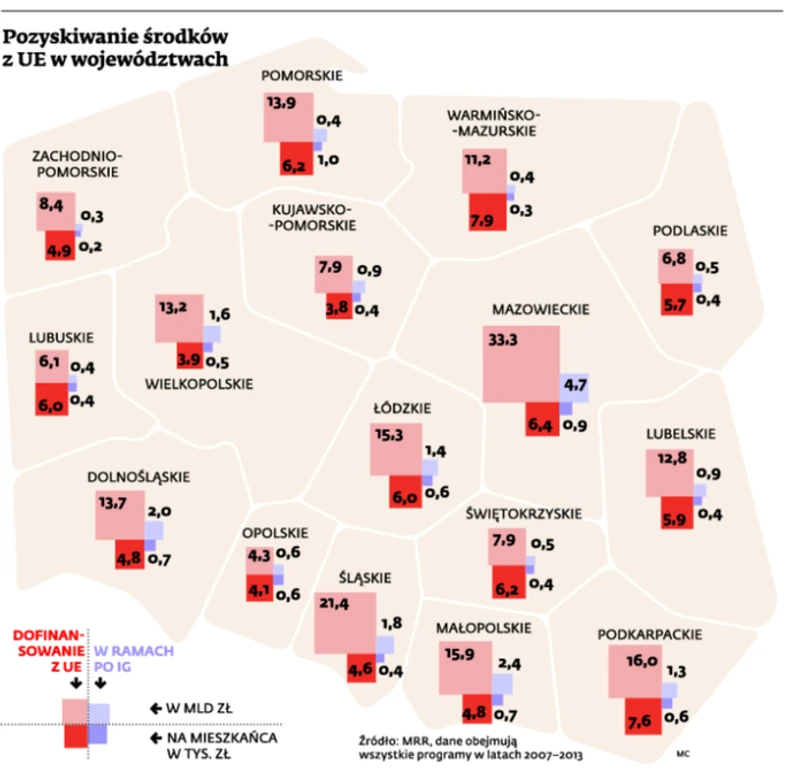 5,7 tys. zł dotacji przypada na każdego obywatela, jeśli podzielić 216,8 mld zł, na które podpisano 78,3 tys. umów w ramach unijnego budżetu na lata 2007–2013 – wynika z danych Ministerstwa Rozwoju Regionalnego. Gdy weźmiemy pod lupę wartość przyznanego finansowania w poszczególnych województwach i podzielimy przez liczbę mieszkańców, to okaże się, że najwięcej pieniędzy na osobę przypada w warmińsko-mazurskim – 7,9 tys. zł, podkarpackim – 7,6 tys. zł, a mazowieckie, choć jest najbogatsze, pod tym względem jest dopiero na trzecim miejscu z 6,4 tys. zł dotacji. Także zamożne woj. dolnośląskie, małopolskie czy wielkopolskie są poniżej średniej krajowej i wyprzedza je wiele biedniejszych regionów.