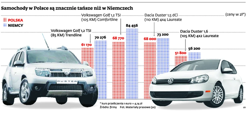 Nawet przy kursie euro na poziomie 4,14 zł niemieccy kierowcy płacą w polskim salonie za volkswagena golfa od 10 do 15 tys. zł mniej niż u siebie. Na innych markach, np. daci, czy hyundaiu, różnice są nieco mniejsze – rzędu 5–6 tys. zł. Jednak decydują też inne aspekty. W przypadku dacii choćby szybka realizacja zamówienia. W Niemczech na dostawę auta trzeba czekać miesiącami, u nas samochód otrzymuje się w ciągu kilku tygodni.