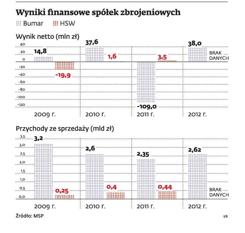 Ale w 2012 r. grupa Bumar osiągnęła 2,6 mld zł przychodu i 38 mln zł zysku netto. To najwyższy od pięciu lat wynik holdingu, do którego należy 25 spółek przemysłu obronnego. Krzysztof Krystowski podkreśla, że dobre wyniki za zeszły rok i podpisane w tym roku kontrakty (łącznie już na sumę 1 mld zł) pozwalają na określenie stabilnych prognoz rozwoju. Jego zdaniem 2013 r. Bumar zakończy z przychodami na poziomie 2,76 mld zł oraz ponad 80 mln zł zysku.