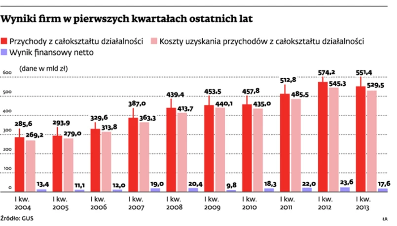Co gorsze, dynamika tempa tego spadku przybrała na sile. O ile w IV kw. ubiegłego roku wpływy z działalności zmalały o 2,9 proc. w skali roku, to w pierwszych trzech miesiącach 2013 r. było to już 4 proc. Największe polskie firmy (GUS zbadał ponad 16,5 tys. przedsiębiorstw zatrudniających 50 osób i więcej) uzyskały 551,4 mld zł, rok wcześniej było to 574,2 mld zł.