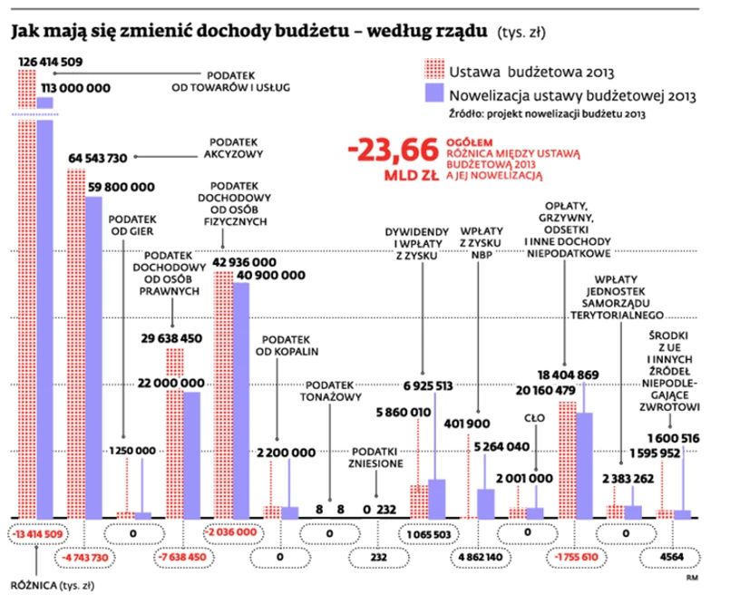 Deficyt budżetu w tym roku nie wyniesie 51,5 mld zł, jak zakłada rząd w przyjętej nowelizacji ustawy budżetowej. Może być o 5–6 mld zł mniejszy. Ministerstwo Finansów przygotowało nowelizację ze sporą nadwyżką, celowo zawyżając ubytek dochodów z niektórych podatków. Dotyczy to zwłaszcza wpływów z VAT. W całym 2013 r. miałyby być one o 13,4 mld zł niższe od planowanych, co oznaczałoby, że w drugiej części roku, mającej upłynąć pod znakiem poprawy w gospodarce, podatki miałyby spływać równie źle jak w I półroczu, kiedy konsumpcja prywatna niemal nie rosła, a inwestycje były na minusie. Ekonomiści, z którymi rozmawialiśmy, nie wierzą w taki scenariusz. I mówią, że wielkość ubytku wpływów z VAT rząd zawyżył. – Wzrost konsumpcji może dojść do 0,7 proc. Poza tym osłabienie złotego zwiększy też wpływy z VAT od importu. W sumie dochody z tego podatku mogą być o 6 mld zł lepsze od zakładanych – mówi Rafał Benecki z ING Banku. Niektórzy eksperci wskazują też inne nowelizacyjne „zakładki”. Jedna to wpływy z podatku dochodowego od firm, które mają być o ponad 7,6 mld zł mniejsze, niż zakłada plan z pierwszej ustawy. Kolejna – wpływy z PIT, przy których niedobór oszacowano na ponad 2 mld zł.