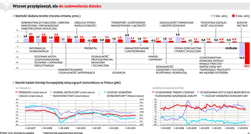 Jeszcze trudniej było firmom, które zaspokajają popyt inwestycyjny. Nakłady brutto na środki trwałe były w II kw. o 3,8 proc. mniejsze niż rok wcześniej (po 2-proc. spadku w pierwszych trzech miesiącach tego roku). Problemy z inwestycjami widać szczególnie w budownictwie. Tu wartość dodana spadała już czwarty kwartał z rzędu. W II kw. br. była o 20,3 proc. mniejsza niż rok wcześniej. To najsłabszy wynik przynajmniej od 1996 r. Trzeba jednak pamiętać, że punktem odniesienia dla najnowszych danych był okres tuż przed ubiegłorocznymi piłkarskimi mistrzostwami Europy, gdy oddawano do użytku duże inwestycje, które właśnie wtedy uwzględniano w statystykach nakładów.