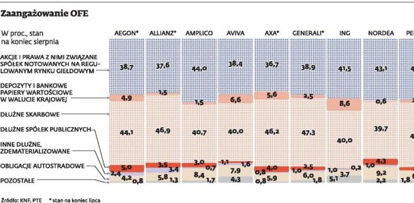 I to właśnie może stanowić poważny problem. Fundusze emerytalne na całym świecie bazują bowiem na dwóch rodzajach inwestycji: bardziej ryzykownych, ale mogących przynieść większe zyski akcjach oraz na stabilniejszych papierach dłużnych, głównie obligacjach skarbowych. Te dwie grupy aktywów stanowią gros portfela inwestycyjnego OFE. Co po zapowiedzianych przez rząd zmianach mogłoby stanowić tę stabilniejszą nogę inwestycyjną? – W obecnej chwili, bez uchwalonych zmian w prawie, nie można jeszcze zdefiniować przyszłej polityki inwestycyjnej otwartych funduszy emerytalnych – odpowiada Marek Sakowski, wiceprezes Pekao Pioneer PTE. Pragnący zachować anonimowość członek zarządu innego PTE jest zdania, że po wprowadzeniu koniecznych zmian prawnych taką rolę mogłyby odegrać listy zastawne oraz obligacje municypalne. – Widziałbym tu też inwestycje w obligacje skarbowe innych krajów, pod warunkiem że posiadałyby one odpowiedni rating – dodaje nasz rozmówca.