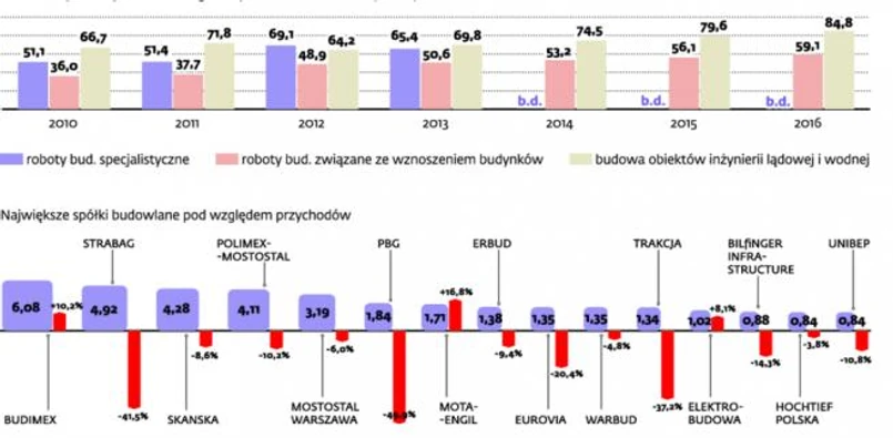 Ostatnie pełne dane dla branży są dostępne za 2012 r. Z raportu Deloitte wynika, że łączne przychody 15 największych spółek budowlanych na polskim rynku przekroczyły 35 mld zł, co oznacza spadek o prawie 17 proc. w porównaniu z 2011 r.
